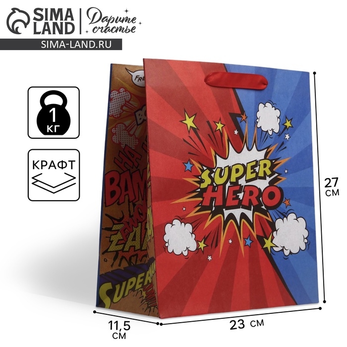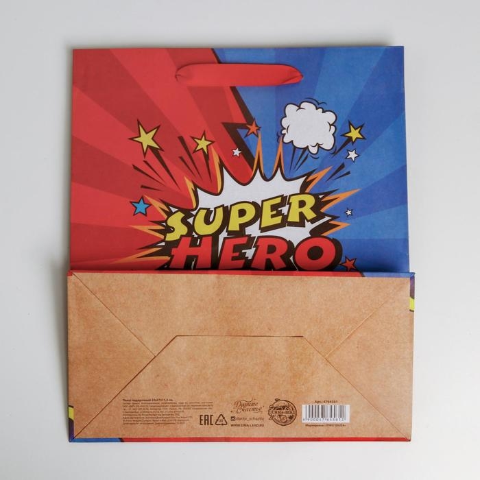 Пакет подарочный крафтовый вертикальный, упаковка, «Супер герой», ML 23 х 27 х 11.5 см