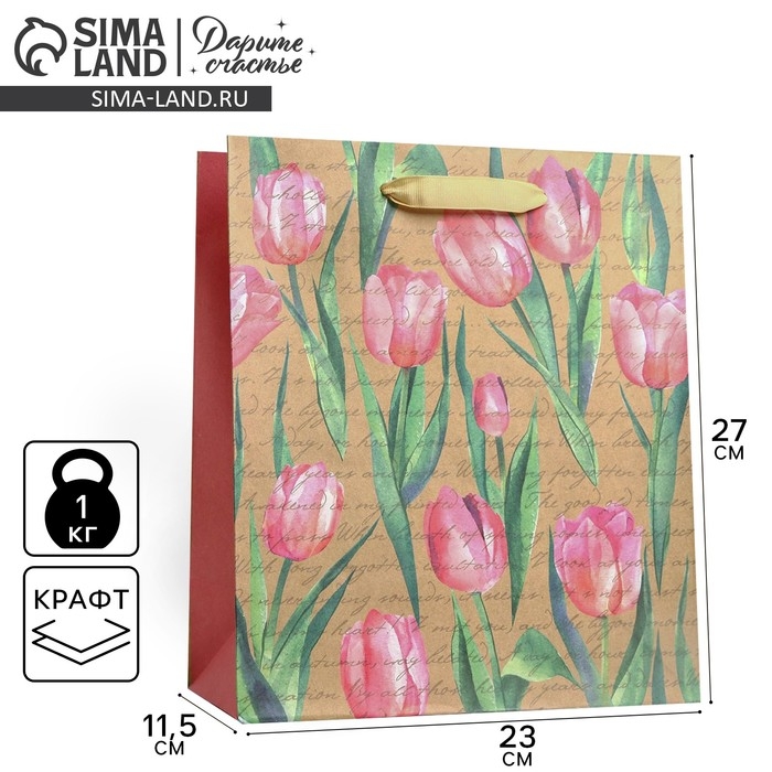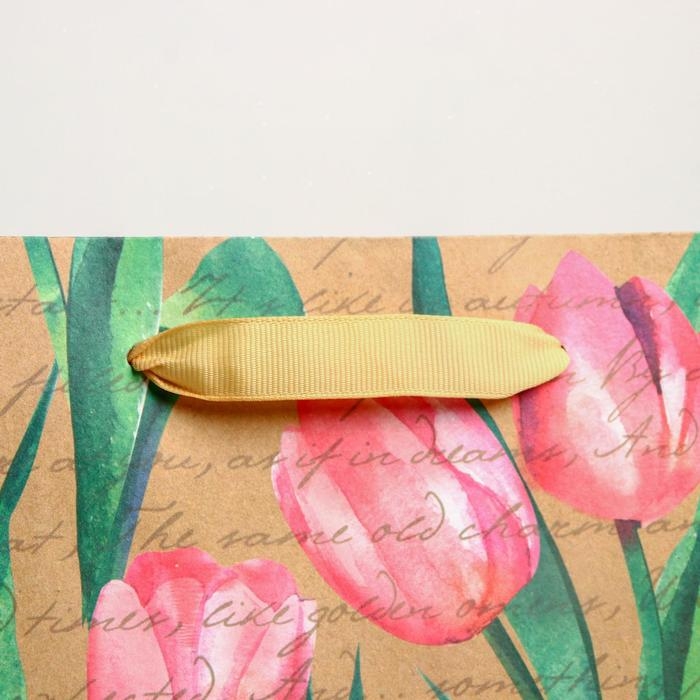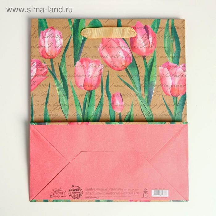 Пакет подарочный крафтовый вертикальный, упаковка, «Тюльпаны», ML 23 х 27 х 11,5 см