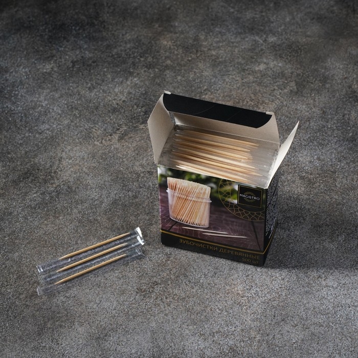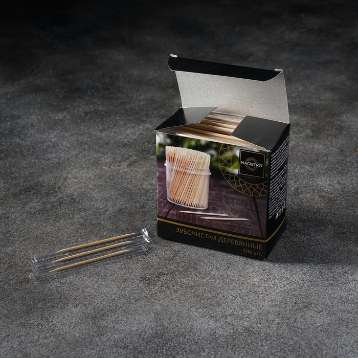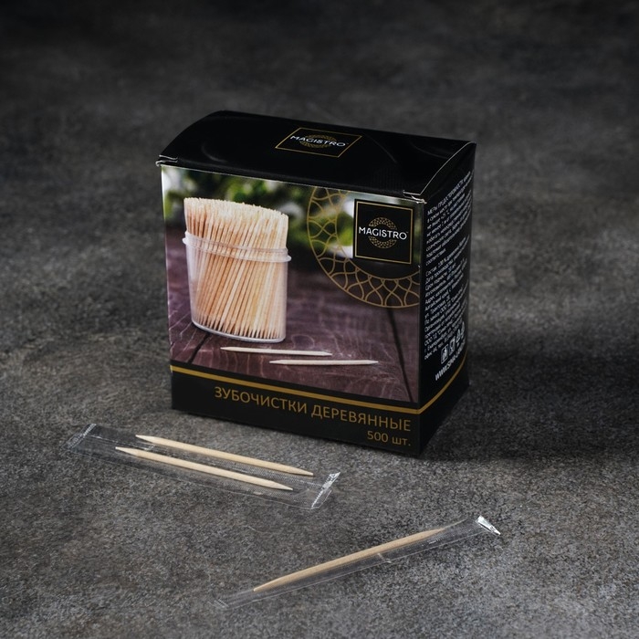 Зубочистки из берёзы Magistro, 500 шт, в индивидуальной упаковке, картонная коробка