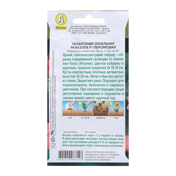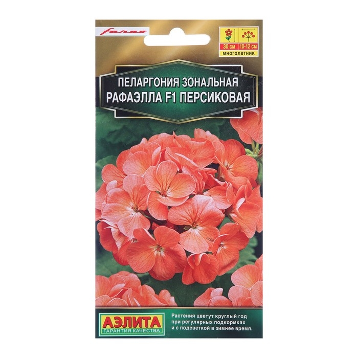 Новые гибриды пеларгонии Рафаэлла F1 персиковая – образец современной селекции. Их красивые, компактные кусты высотой 30 см хорошо разветвлены, выглядят сильными, густыми, плотными. Венчающие куст пышные шары соцветий 12 см диаметром имеют богатую палитру цветов. Гибриды легко и быстро растут из семян – всходы появляются через 1-1,5 недели, зацветают на ранней стадии развития. Применение универсальное:горшечное содержание в комнатах, на солнечных балконах и в качестве летника в садовых цветниках. Растения устойчивы к жаре, хорошо переносят кратковременные понижения температуры. При соответствующем уходе (регулярные подкормки и подсветка в зимнее время) цветут круглый год.