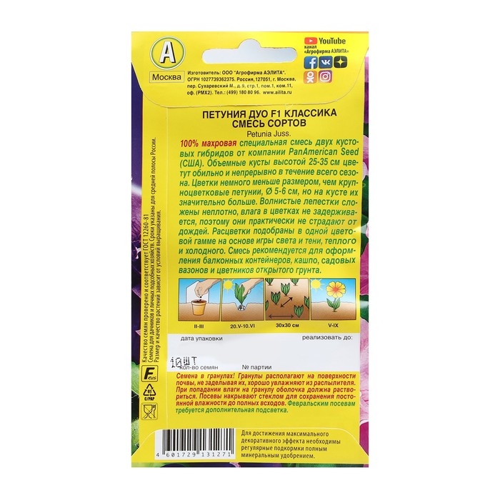 Семена Цветов Петуния Дуо Классика F1 многоцветковая махровая, смесь окрасок, 10шт