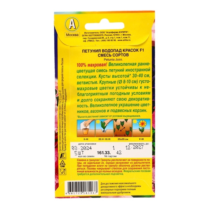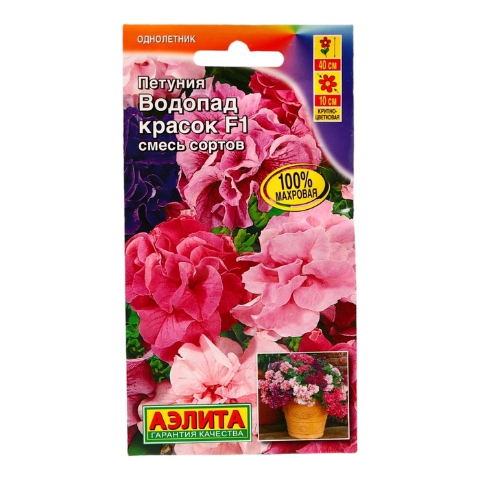 100% махровая. Петуния «Водопад красок» одна из самых ранних в цветении среди махровых петуний, с прекрасными характеристиками роста, великолепным ветвлением и обильным, длительным цветением. Крупные (10-13 см в диаметре) густомахровые цветки очень устойчивы к неблагоприятным погодным условиям, долго сохраняют свою декоративность и будут великолепным украшением цветников, вазонов и подвесных корзин.