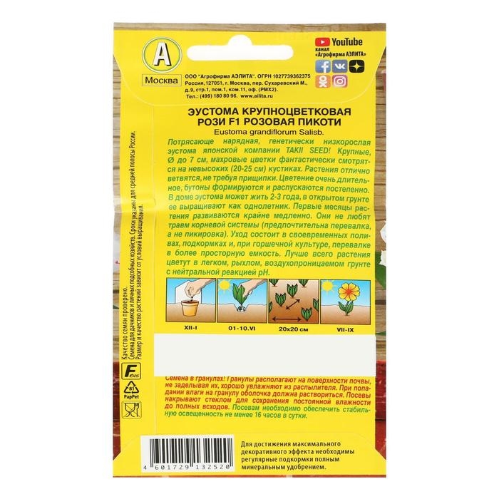 Потрясающе нарядная генетически низкорослая эустома японской селекции! Крупные, до 7 см в диаметре, махровые цветы фантастически смотрятся на невысоких, 20-25 см кустиках. Растения отлично ветвятся, не требуя прищипки. Цветение очень длительное, бутоны формируются и распускаются постепенно. В доме эустома может жить 2-3 года, в открытом грунте её выращивают как однолетник. Первые месяцы растения развиваются крайне медленно. Они не любят травм корневой системы (предпочительна перевалка,а не пикировка). Уход состоит в своевременных поливах, подкормках и, при горшечной культуре, перевалке в более просторную ёмкость. Лучше всего растения цветут в лёгком, рыхлом, воздухопроницаемом грунте с нейтральной реакцией pH.