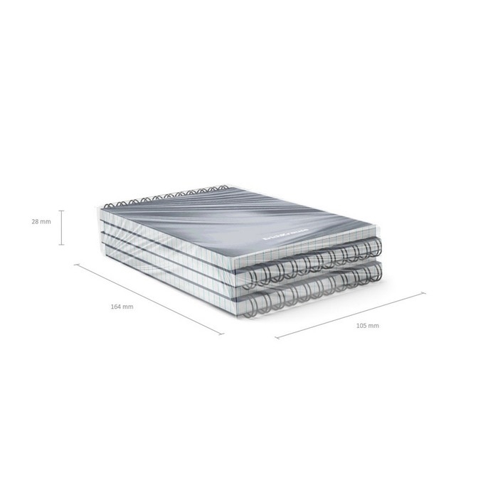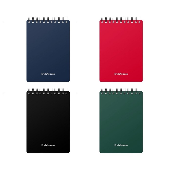Блокнот формата А6 (102x146 мм). Обложка из высококачественного износостойкого матового пластика с фактурой «песок». В блоке 60 листов в клетку. Бумага офсетная плотностью 55 г/м2. Цвет линовки — синий. Скругленные уголки обложки. Тип скрепления — спираль. Блокноты одного цвета упакованы в термоусадочную пленку по 4 штуки. Товар поставляется в нескольких вариантах цвета без возможности выбора.