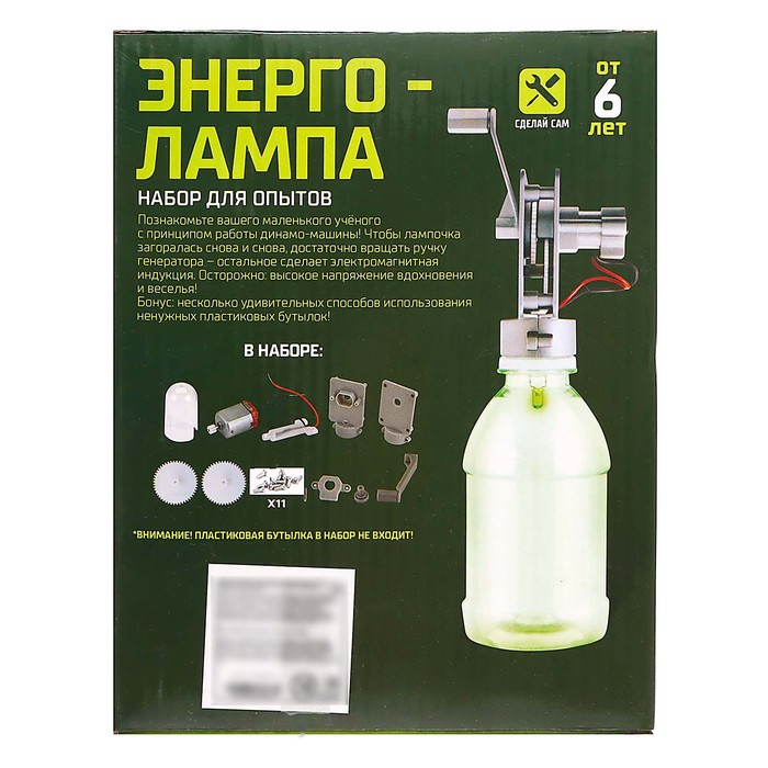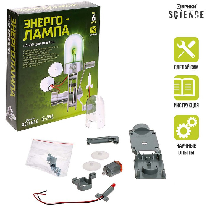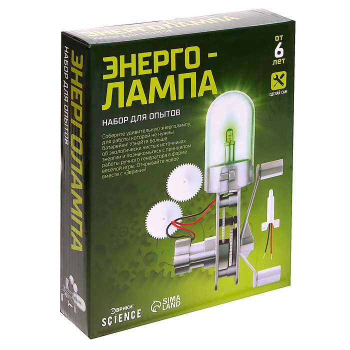 С электронным набором для опытов «Энерголампа» ребёнок сделает осветительный прибор, для которого не нужны батарейки, узнает больше об экологически чистых источниках, и познакомится с принципом работы ручного генератора.