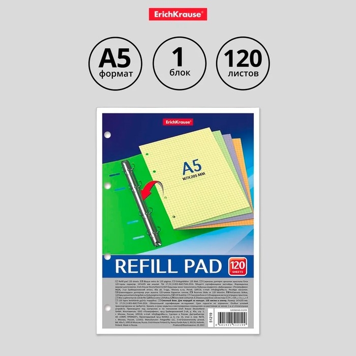 Сменный блок для тетрадей на кольцах формата А5 (147 х 205 мм). Благодаря плотной верхней обложке блок не деформируется. 120 листов в клетку. 4 цвета по 30 листов. Бумага офсетная плотностью 65 г/м2. Цвет линовки - синий. Перфорация под кольца. Имеет индивидуальную упаковку в термоусадочную пленку.