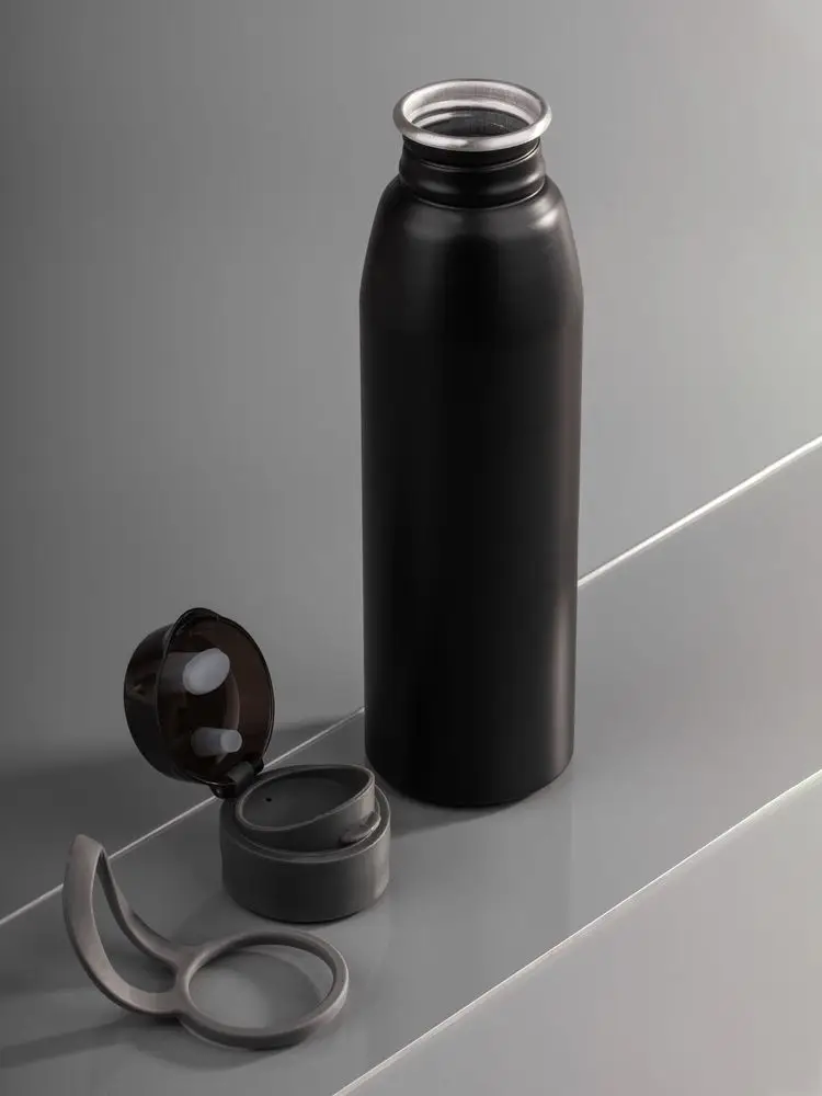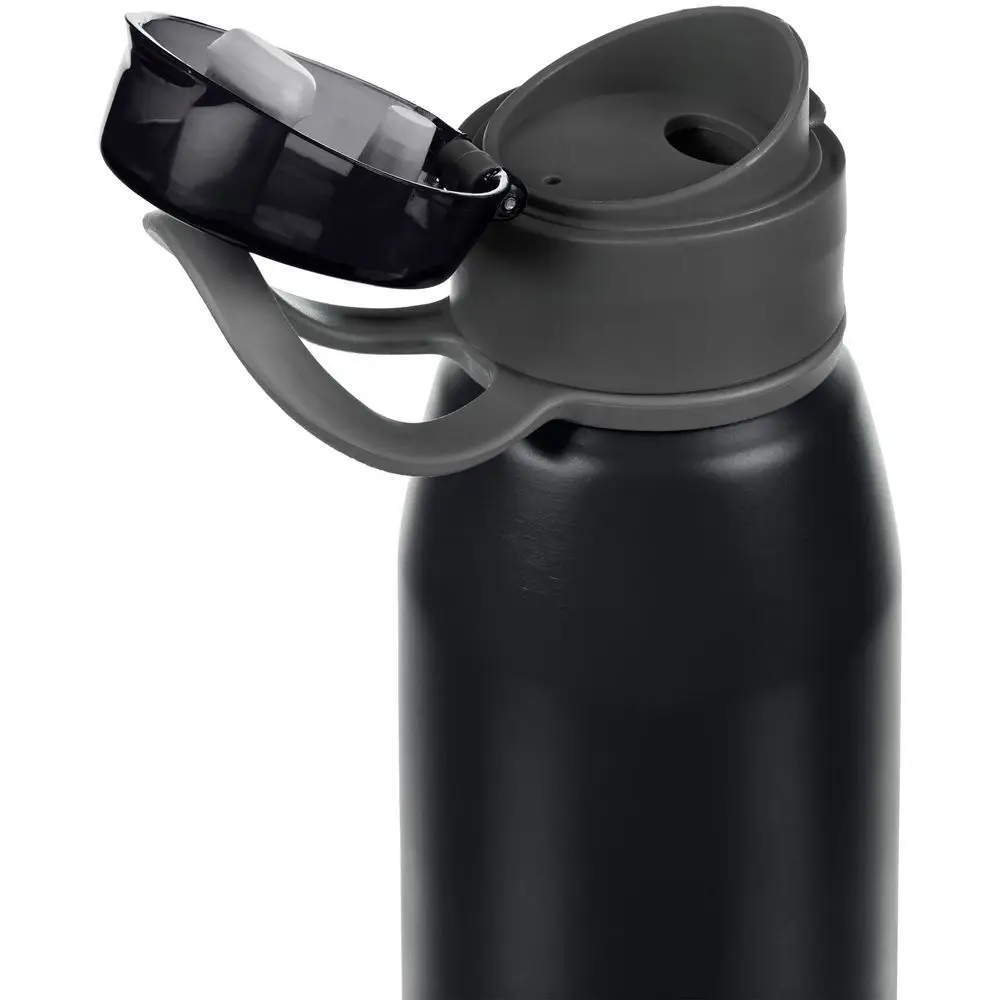 Легкая бутылка для спорта с откидной крышкой и силиконовой петлей для удобной транспортировки.