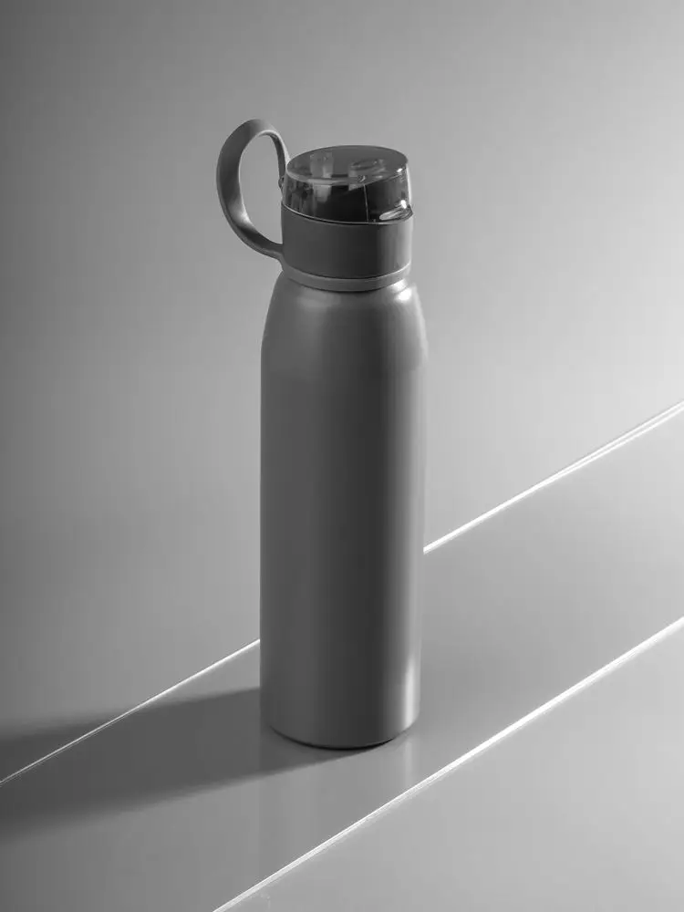 Легкая бутылка для спорта с откидной крышкой и силиконовой петлей для удобной транспортировки.