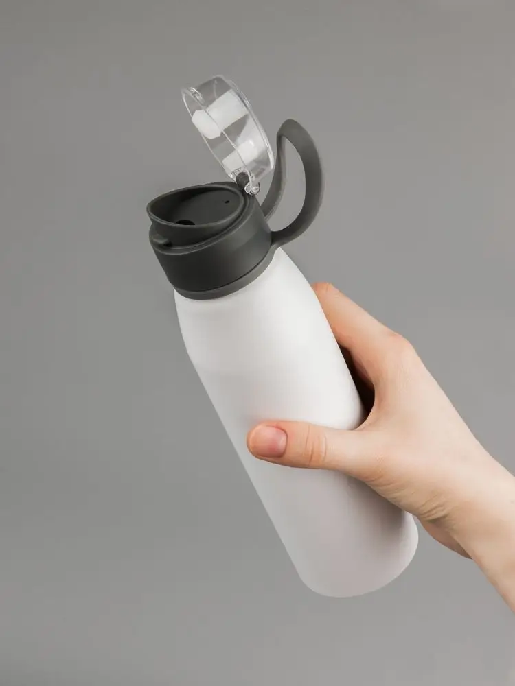 Легкая бутылка для спорта с откидной крышкой и силиконовой петлей для удобной транспортировки.