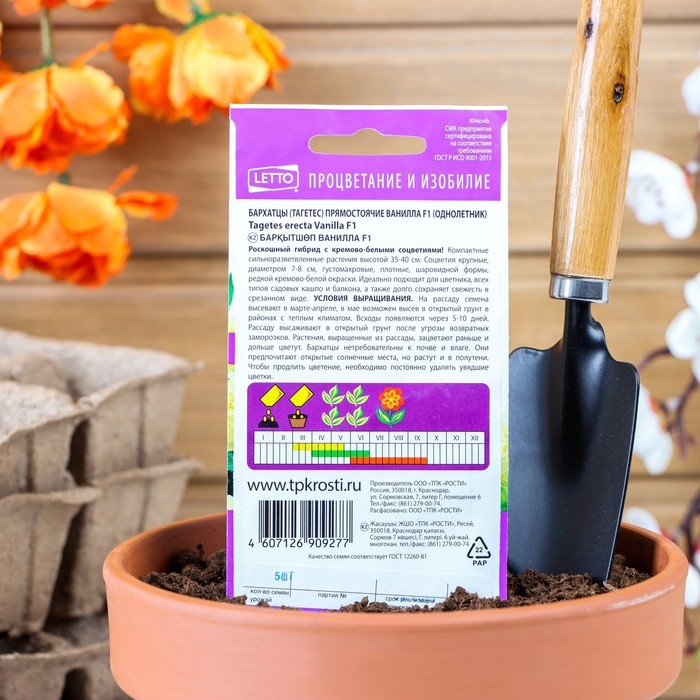Роскошный срезочный гибрид с кремово-белыми соцветиями диаметром до 12 см. Удачно сочетается с декоративными растениями любой цветовой гаммы. Образует куст высотой 70 см с ясно выраженным главным побегом. Цветет с июня до заморозков. Бархатцы светолюбивы и теплолюбивы, заморозков не переносят, к почвам нетребовательны, но предпочитают плодородные легкие почвы. Посев на рассаду проводят во второй половине марте-начале апреля. Всходы появляются через 4-8 дней после посева, сеянцы пикируют в фазе 2-го настоящего листа. Рассаду высаживают в начале июня с расстоянием между растениями 30-35 см. Посев в открытый грунт проводят в мае на глубину 1,5-2 см.