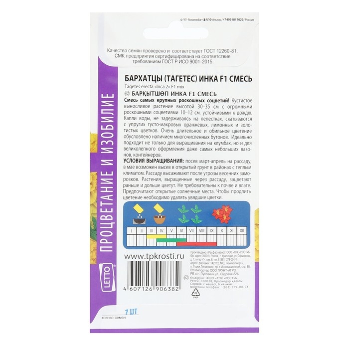 Семена цветов Бархатцы "Инка", F1, смесь, низкорослые, крупноцветковые,О, 7 шт