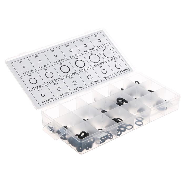 Набор предназначен для уплотнения резьбовых соединений различных элементов. Прокладка делает соединение адаптера с насадками и соединителя со шлангом более надёжным и герметичным. Набор резиновых уплотнительных прокладок предоставляется в компактном кейсе из пластика, который обладает отсеками под каждый размер и нумерацией размеров на крышке. Прокладки выполнены из резины и служат для герметизации различных соединений. Достаточно купить такой набор, чтобы надолго обеспечить дом нужными расходниками. Набор можно использовать в автосервисе и на станции технического обслуживания при ремонте системы кондиционирования автомобиля, а также во время других ремонтно-монтажных работ, например, сантехнических (для смесителей, фитингов и пр.). Прокладки изготовлены из качественной резины и упакованы в полиэтиленовый пакет. В комплекте представлены уплотнительные прокладки самых распространенных размеров.