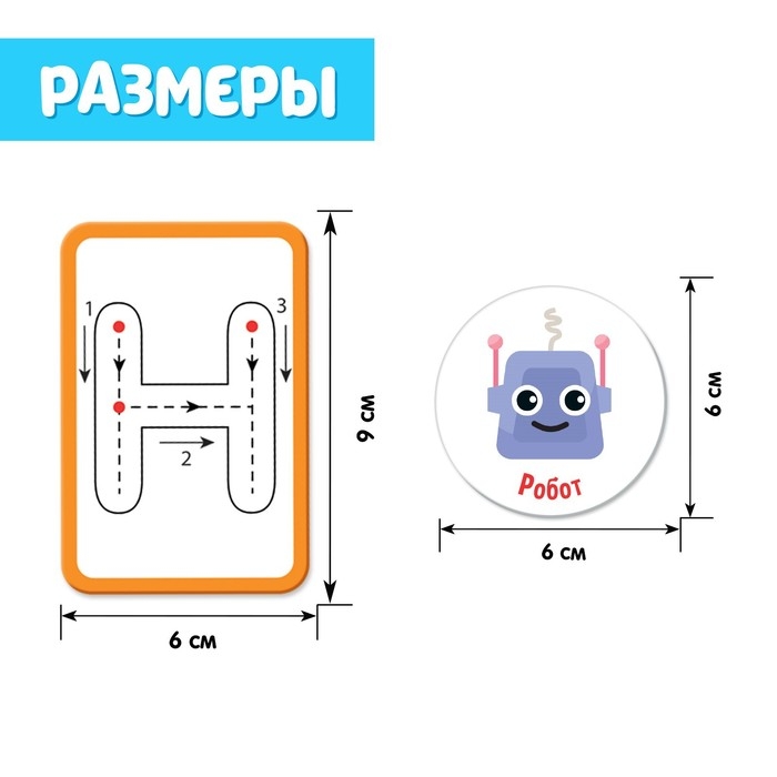 В комплекте малыш найдёт маркер, 33 карточки с буквами, 33 карточки с картинками. Набор рекомендован детям старше 3 лет.