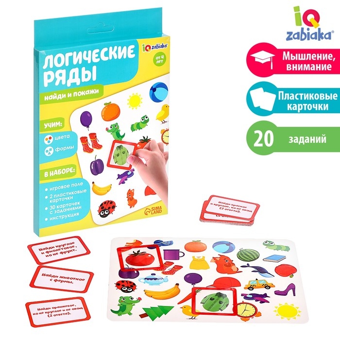 Развивающий набор «Логические ряды: найди и покажи», создан для детей от 3 лет. В комплект входит 30 заданий и 2 пластиковые карточки.