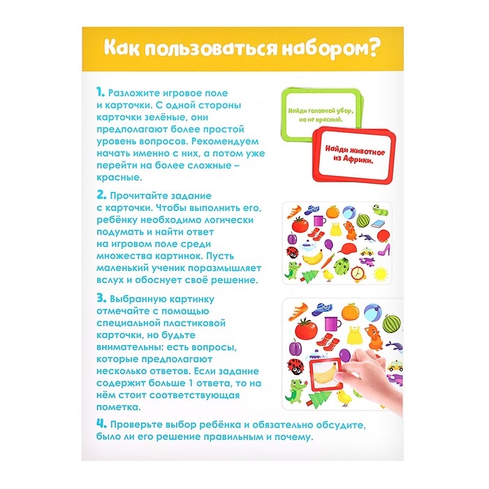 Набор поможет в игровой форме научить ребёнка рассуждать логически. Он обогатит свой словарный запас, разовьёт речь, мышление и внимание.