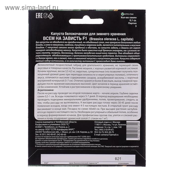 Семена Капуста белокочаная "Всем на зависть", F1, 0,1г