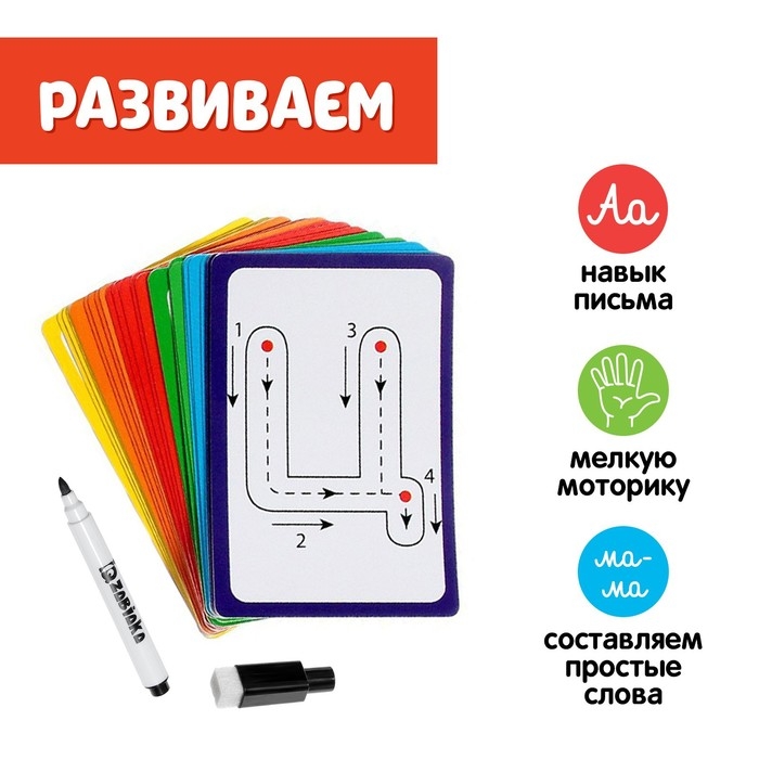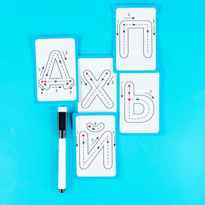 В комплекте 33 карточки с буквами и маркер «пиши-стирай».