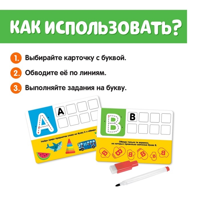 В комплекте малыш найдёт маркер и 32 задания. Набор рекомендован детям старше 3 лет.