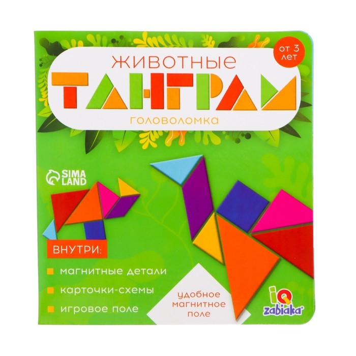 Танграм «Животные» включает в себя 8 геометрических магнитных фигур и схемы для сборки. Попросите ребёнка собрать силуэты зверюшек.