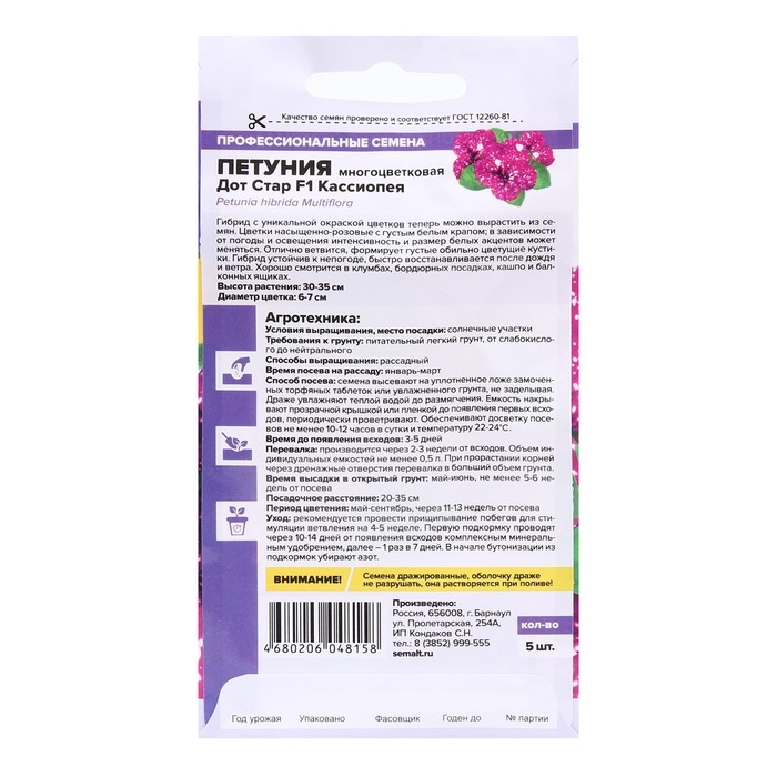 Неведомые тайны космоса на вашем участке – уникальные гибриды новейшей серии низкорослой многоцветковой петунии «Дот Стар F1». Растения формируют кустики высотой 30-35 см, отлично ветвятся, характеризуются ярким обильным цветением. Сочетание насыщенных окрасок и белых крапинок придает цветкам необыкновенно привлекательный вид. Серия отличается высокой устойчивостью к неблагоприятным погодным условиям: после сильного дождя растения быстро восстанавливают свой внешний вид. Светолюбивое и достаточно засухоустойчивое растение. Предпочитает легкие плодородные, хорошо дренированные почвы. Посевы на рассаду проводят с середины февраля. Семена равномерно распределяют по поверхности субстрата, не заделывая, а лишь слегка вдавливая в грунт. Для получения наилучшего результата посев рекомендуем проводить в торфяные таблетки (одно драже в таблетку). Посевы увлажняют из распылителя и накрывают стеклом для поддержания постоянной влажности. Емкость помещают в светлое теплое место (+22-24°С). Всходы появляются через 10-15 дней, стекло убирают. Февральским посевам требуется дополнительная подсветка. Пока всходы мелкие, их лучше не поливать, а опрыскивать, избегайте попадания на них прямых солнечных лучей. Пикировку проводят в фазе 1-2-х настоящих листочков. В открытый грунт рассаду высаживают в конце мая - начале июня, когда минует угроза возвратных заморозков. Посадочный интервал – 30-40 см. Обильное и продолжительное цветение с июня до осенних заморозков. Возможно сохранение растений зимой в освещенном помещении при температуре около +12°С с предварительной обрезкой побегов. Внимание! Семена дражированные - оболочку драже не разрушать!