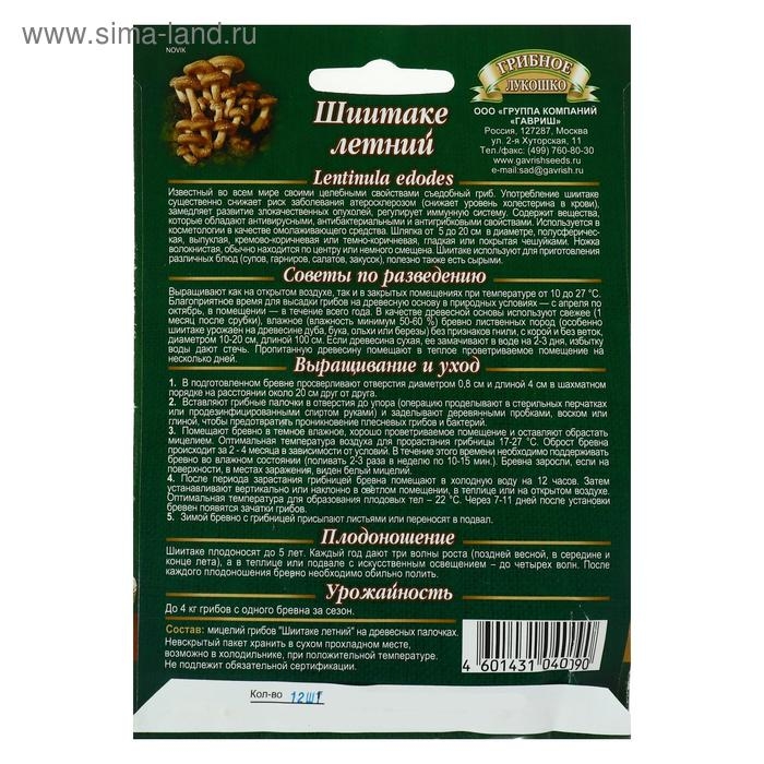 Состав: мицелий грибов "Шиитаке летний" на древесных палочках. Невскрытый пакет хранить в сухом прохладном месте, возможно в холодильнике при положительной температуре.