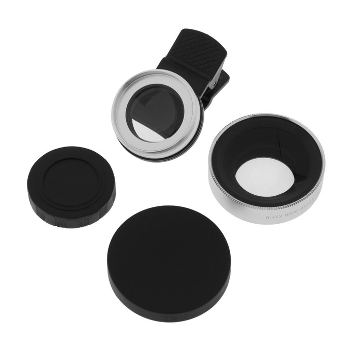 Макрообъектив в основном используется для съемки небольших объектов. Может увеличить объект в 10-12 раз для этого держите камеру на расстоянии 1-2 см от объекта съемки. 0.45 - объектив рыбий глаз обеспечивает широкое поле зрения, расширяет сферу изображения, он должен использоваться с макро объективом.