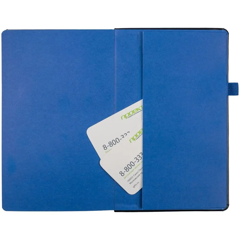 Ежедневник с твердой обложкой, выполнен из материала Waltz, черный АА, дополнен синей резинкой и ляссе.