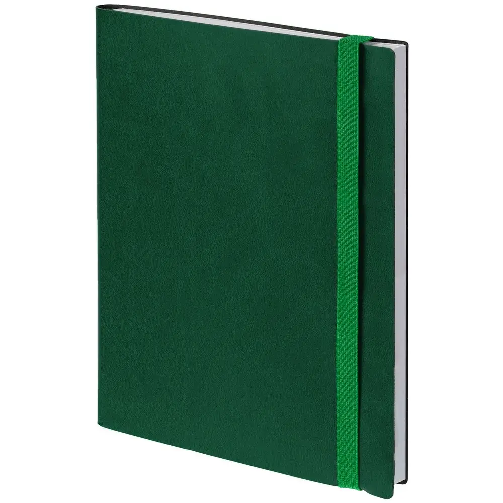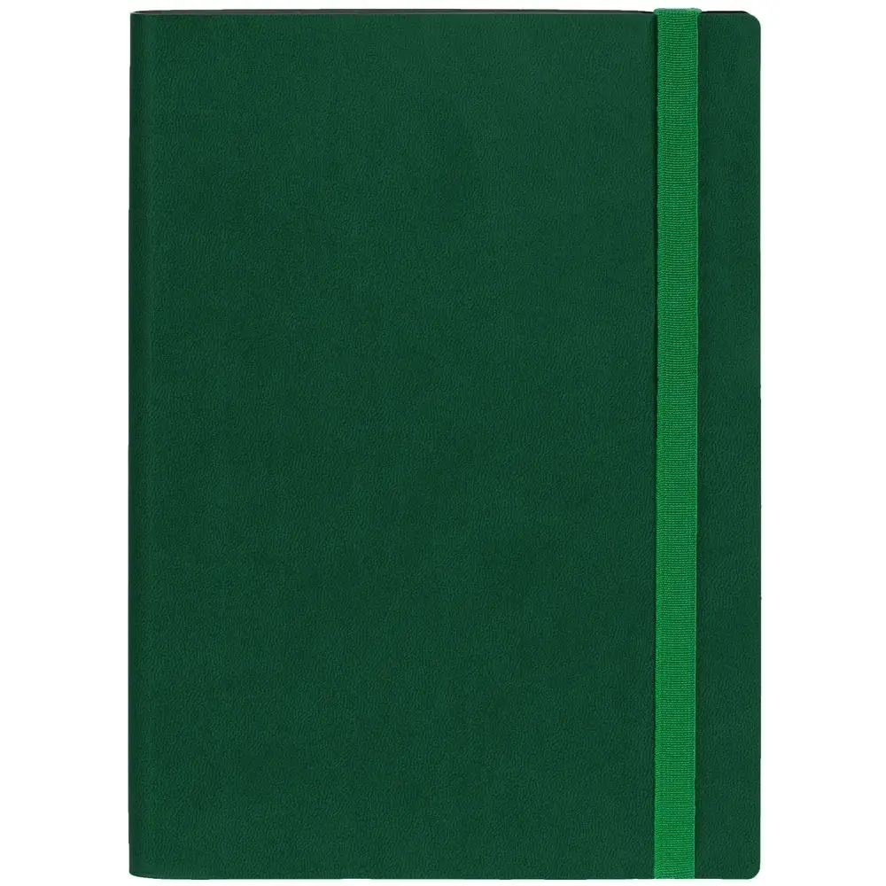 Ежедневник с гибкой обложкой выполнен из материала Latte, зеленый FF, и дополнен резинкой шириной 1 см, капталом и ляссе в цвет обложки.