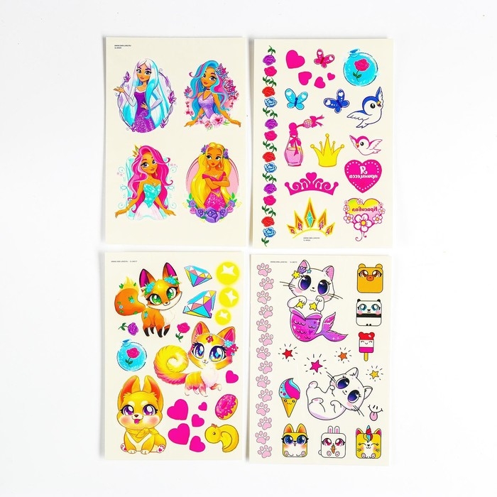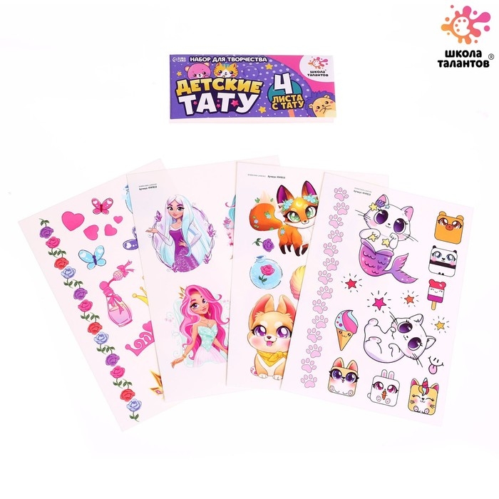 В комплекте 4 листа тату с милыми рисунками.