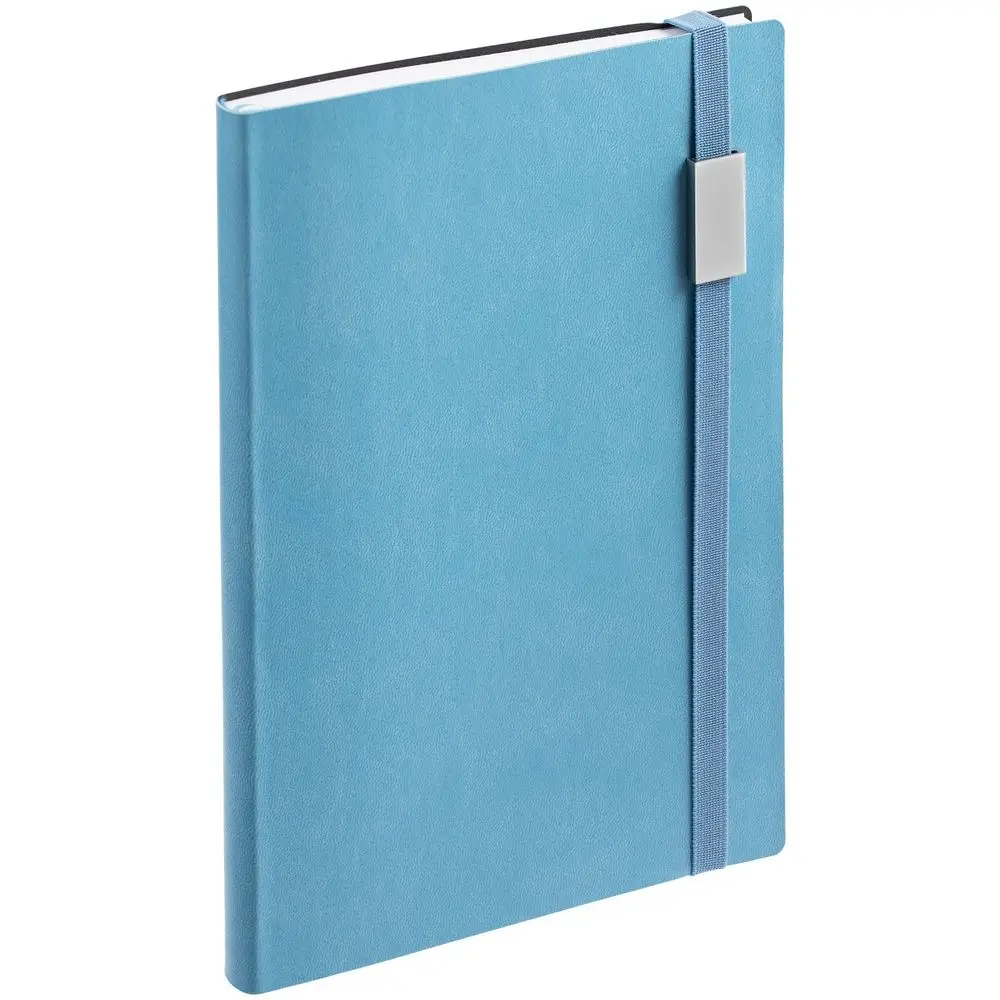 Ежедневник с гибкой обложкой, выполнен из материала Latte, голубой JJ, дополнен резинкой шириной 1 см с металлическим шильдом, капталом и ляссе голубого цвета.
