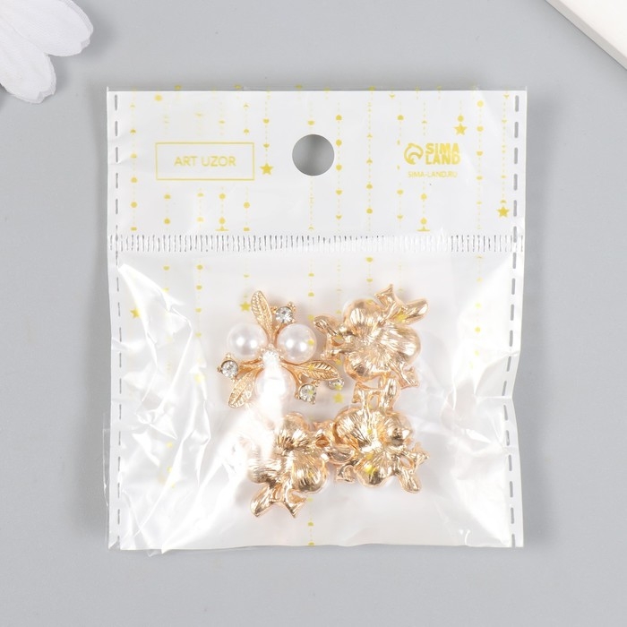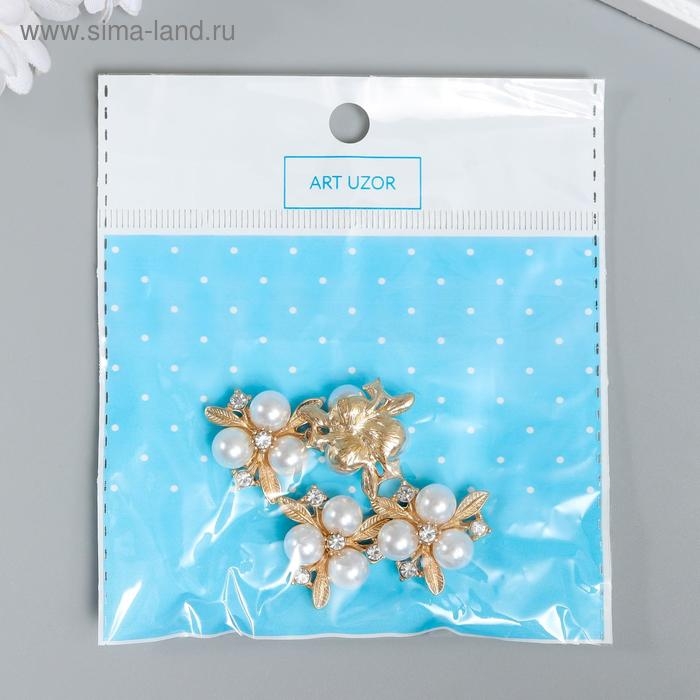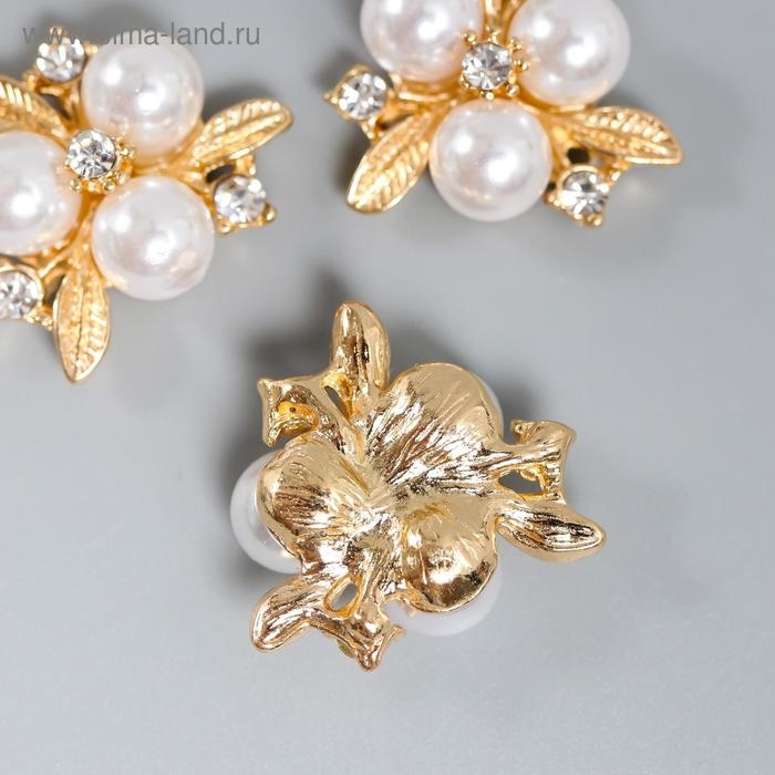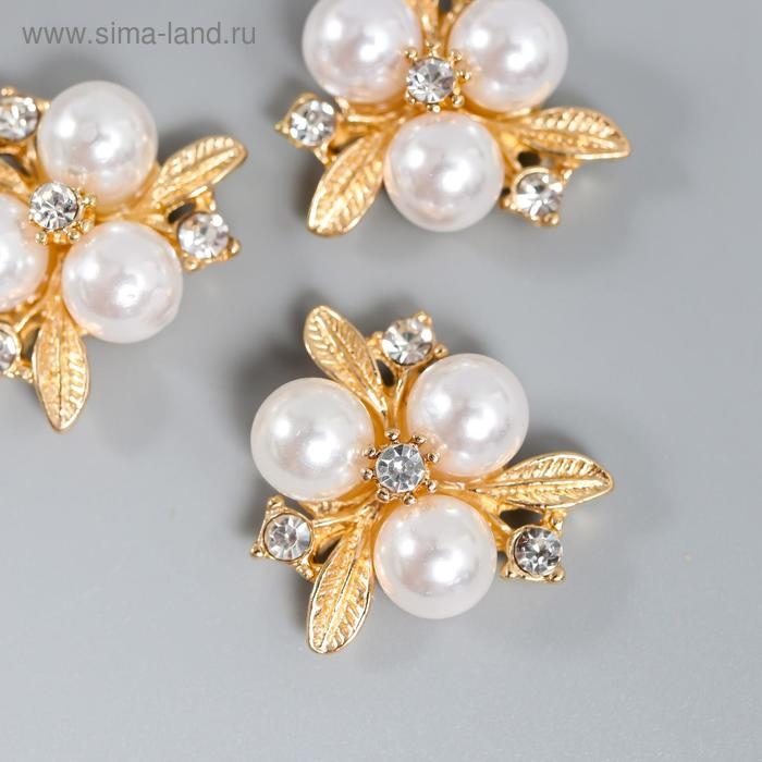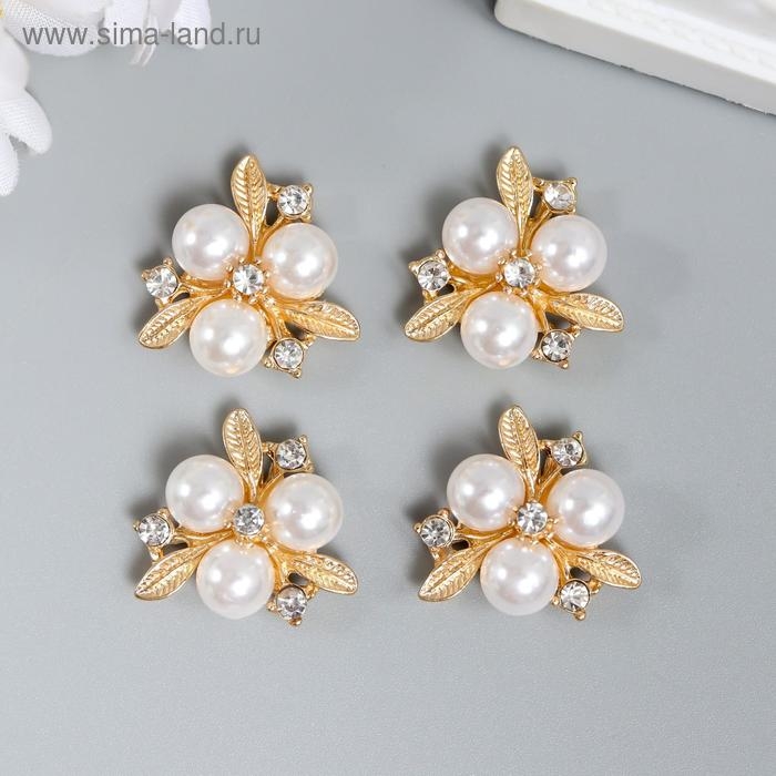 Декор для творчества металл "3 жемчужины с листьями, стразы" набор 4 шт 2,3х2,3 см