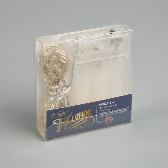 Гирлянда «Нить» 5 м роса, IP20, серебристая нить, 50 LED, переливы, батарейки AAх3 (нет в комплекте), свечение мульти (RGB)