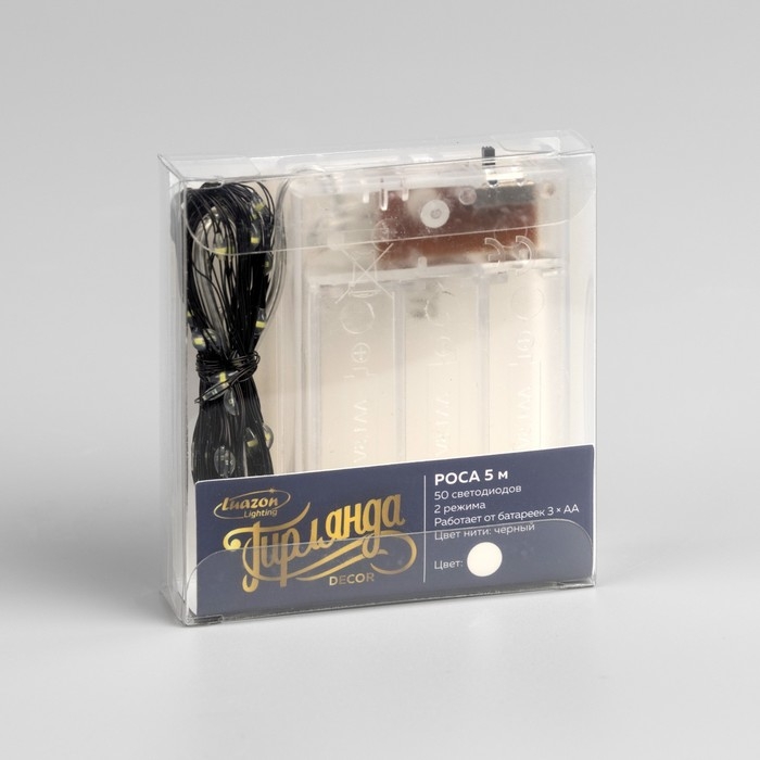 Гирлянда «Нить» 5 м роса, IP20, чёрная нить, 50 LED, 2 режима, батарейки AAх3 (нет в комплекте), свечение белое