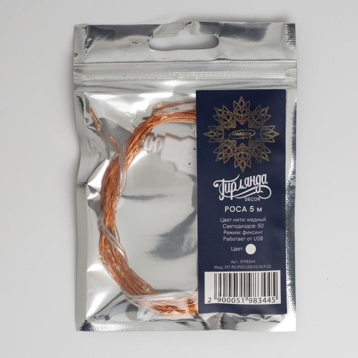 Гирлянда «Нить» 5 м роса, IP20, медная нить, 50 LED, свечение белое, USB