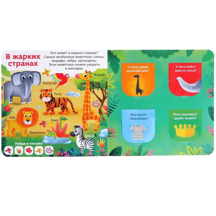 Из Издания ребёнок узнает, какие животные в какой среде обитают. Также малыш будет отгадывать загадки и поиграет в интересную игру «найди и покажи».