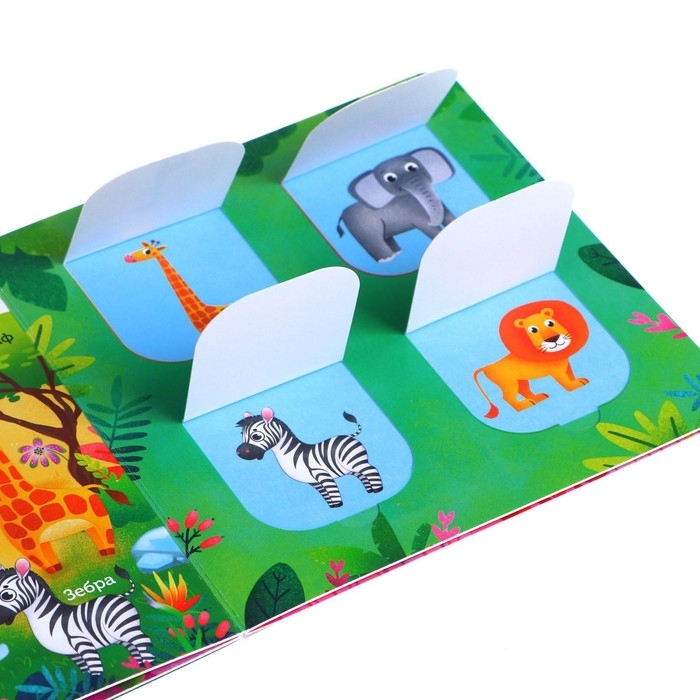 Книга сделана из плотного картона, поэтому прослужит долго. Внутри ребёнок найдёт 16 окошек с яркими изображениями животных и птиц. Также в книжке есть интересные задания «найди и покажи». Между окошками малыш в игровой форме найдёт логическую связь.