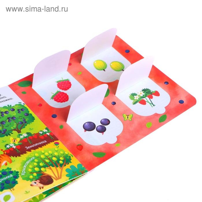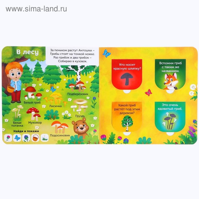 Книга сделана из плотного картона, поэтому прослужит долго. Внутри ребёнок найдёт 16 окошек с яркими изображениями грибов, ягод, животных. Также в книжке есть интересные задания. Между окошками малыш в игровой форме найдёт логическую связь.