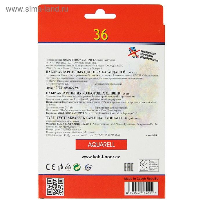 Карандаши акварельные Koh-I-Noor Fish 3719/36, 36 цветов, картонная коробка, европодвес