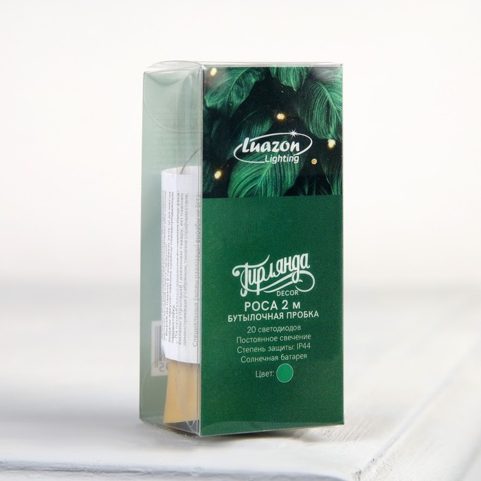 Гирлянда «Нить» 2 м роса с пробкой, IP44, серебристая нить, 20 LED, свечение зелёное, фиксинг, солнечная батарея