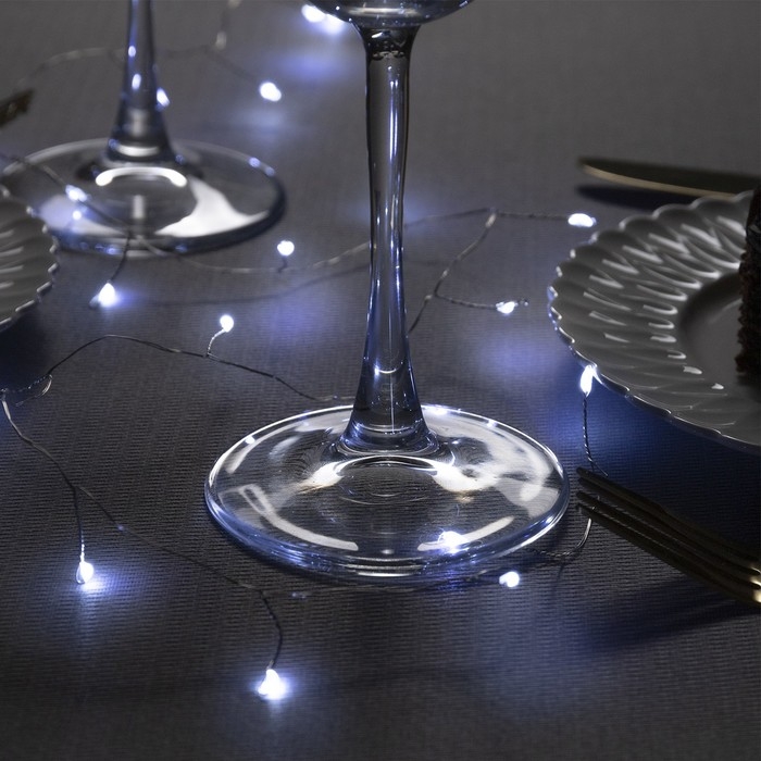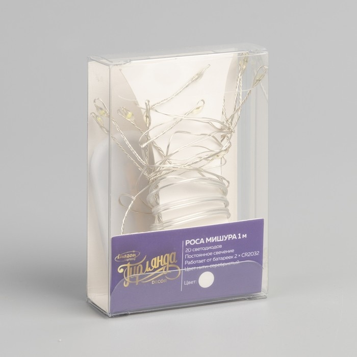 Гирлянда «Мишура» 1 м роса, IP20, серебристая нить, 20 LED, батарейки CR2032х2 (в комплекте), свечение белое