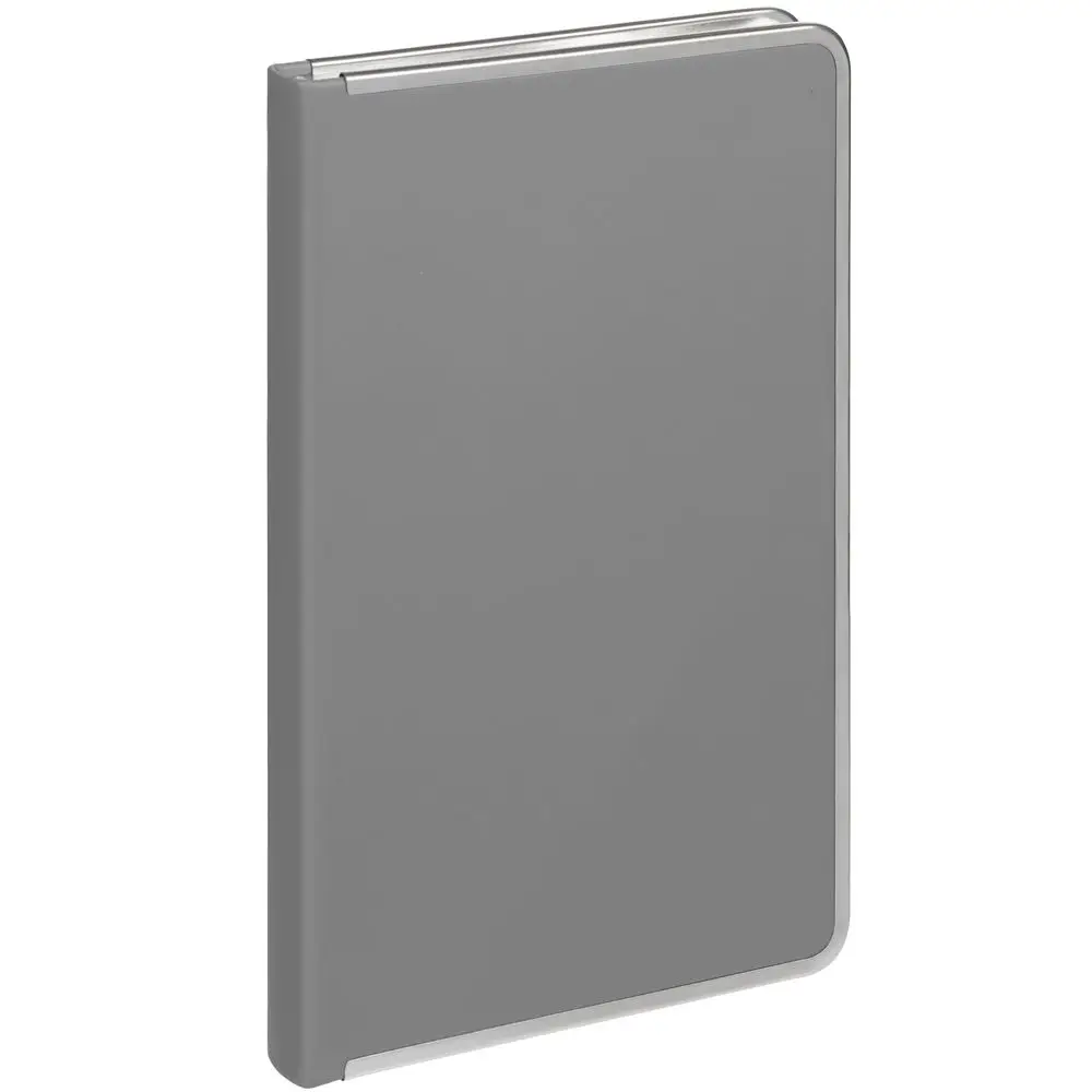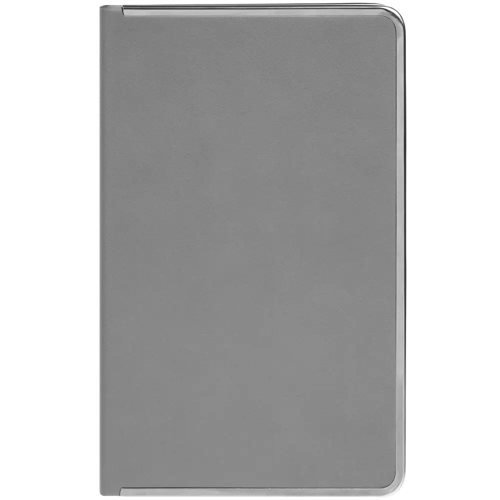 Изящный ежедневник с зауженным блоком и стильными деталями — металлической окантовкой на обложке и металлизированным обрезом.