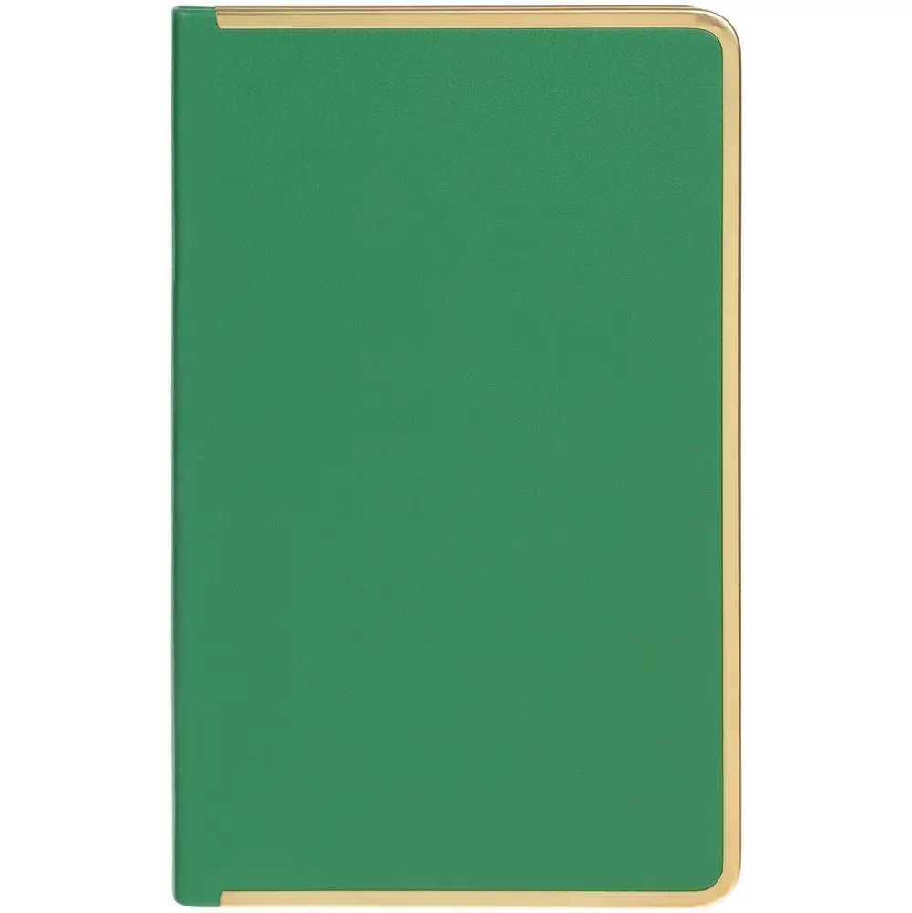 Изящный ежедневник с зауженным блоком и стильными деталями — металлической окантовкой на обложке и металлизированным обрезом.