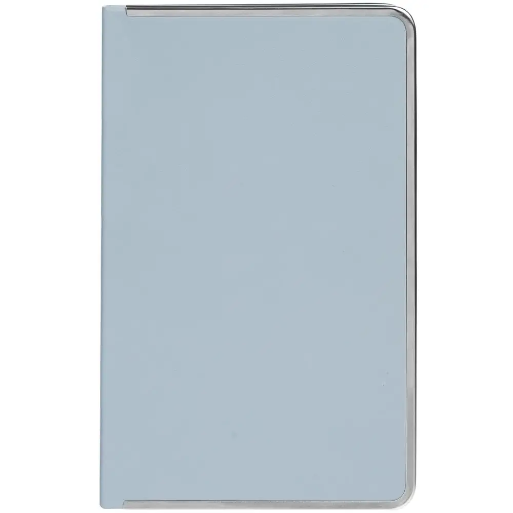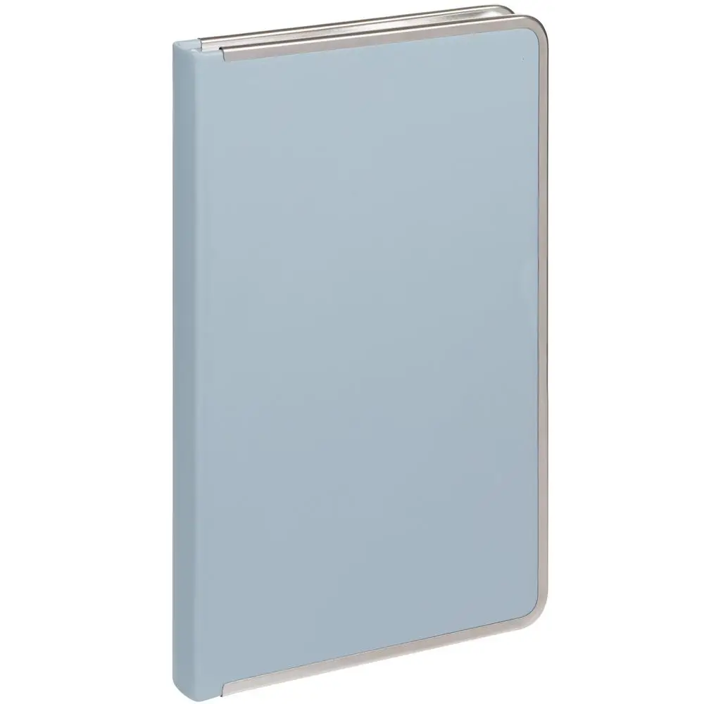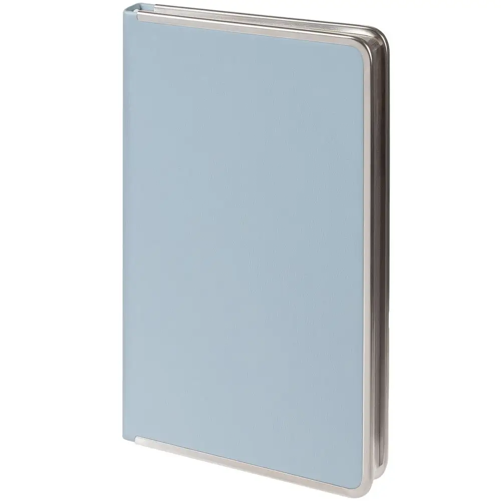 Изящный ежедневник с зауженным блоком и стильными деталями — металлической окантовкой на обложке и металлизированным обрезом.