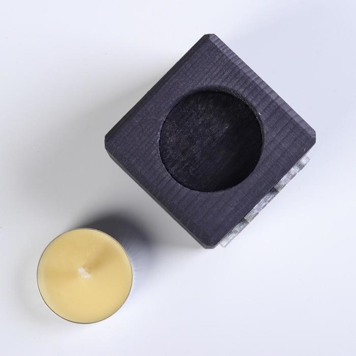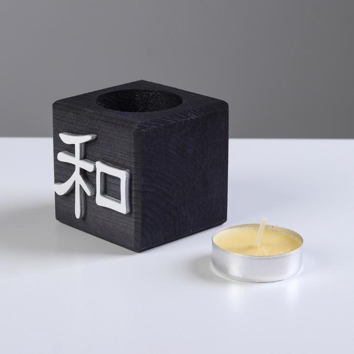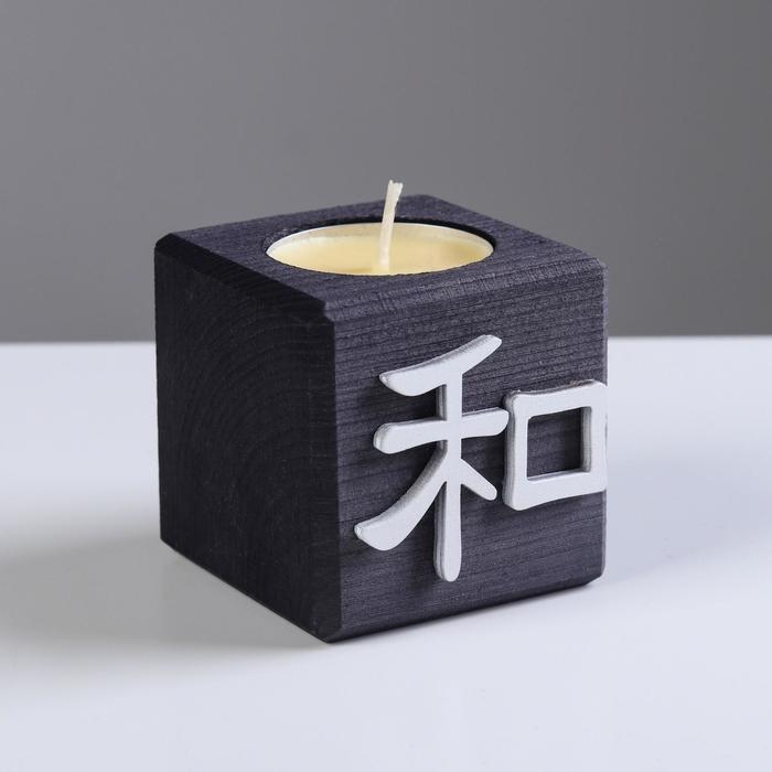 Свеча в деревянном подсвечнике "Куб, Иероглифы. Гармония", эбен, аромат манго