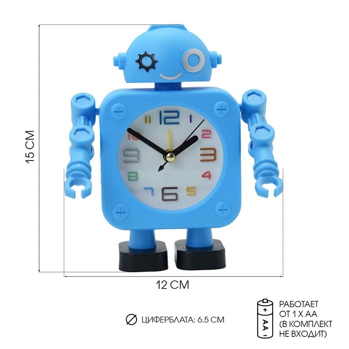 Часы с будильником представлены в ярком дизайне в форме робота, они отлично впишутся в ваш интерьер. Интерьерные часы станут прекрасным декором для дома и дачи, их можно поставить как на прикроватную тумбочку в спальне, детской комнате, гостиной так и на стол или на комод в зале, холле или на кухне. Будильник настольный имеет кварцевый механизм, который гарантирует высокую точность хода. Часы настольные обладают громким будильником, ребенку и вам будет комфортно просыпаться, на работу и в школу. Будильник на батарейках не требует частой замены батареек благодаря экономичному механизму.