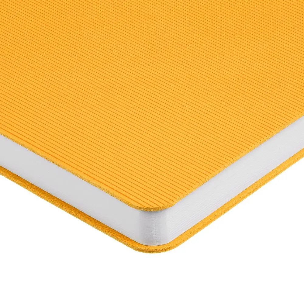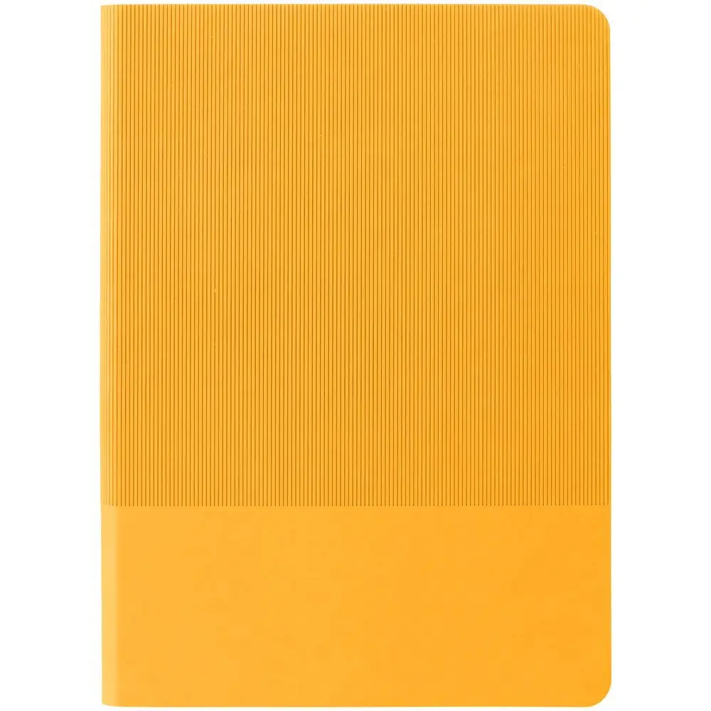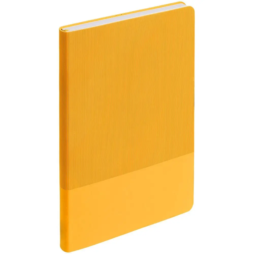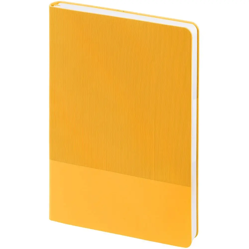 Ежедневник с гибкой обложкой выполнен из материала Soft Touch, желтый KK и Latte, желтый (внутренний материал); дополнен ляссе желтого цвета и фактурным тиснением обложки.