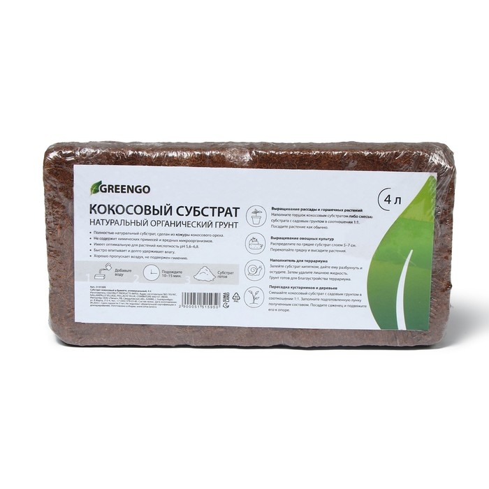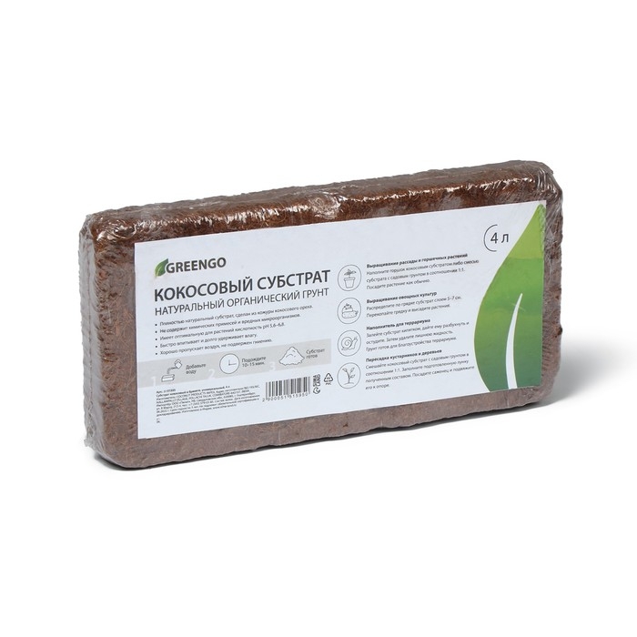 Субстрат Greengo кокосовый, универсальный, натуральный грунт для террариумов и растений, в брикете, 4 л при разбухании