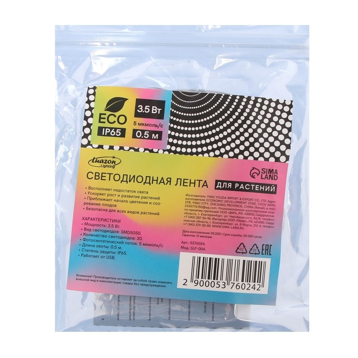 Фитолента светодиодная Luazon, 5 В, SMD5050, 0.5 м, IP65, 3.5 Вт, 60 LED/м, дим., USB