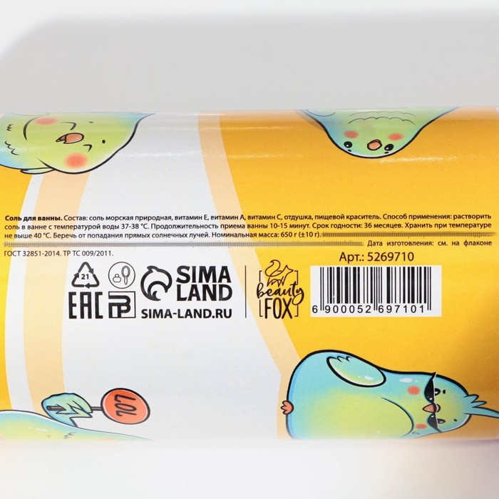 Состав: соль морская природная, витамин Е, витамин А, витамин С, отдушка, пищевой краситель.