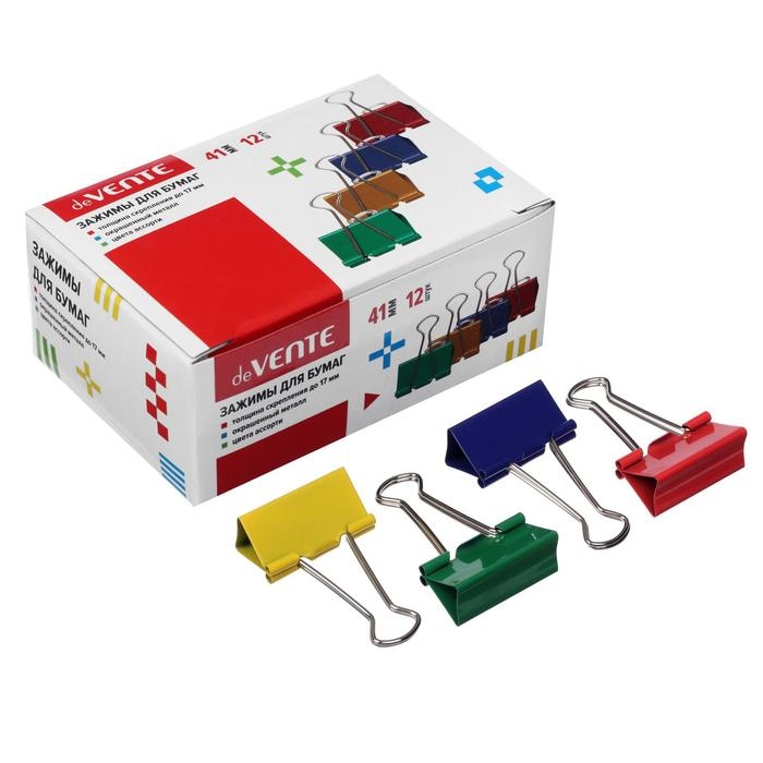 Зажим для бумаг deVENTE металлический (41 мм) толщина скрепления до 17 мм, цветной ассорти, 12 штуки в картонной коробке